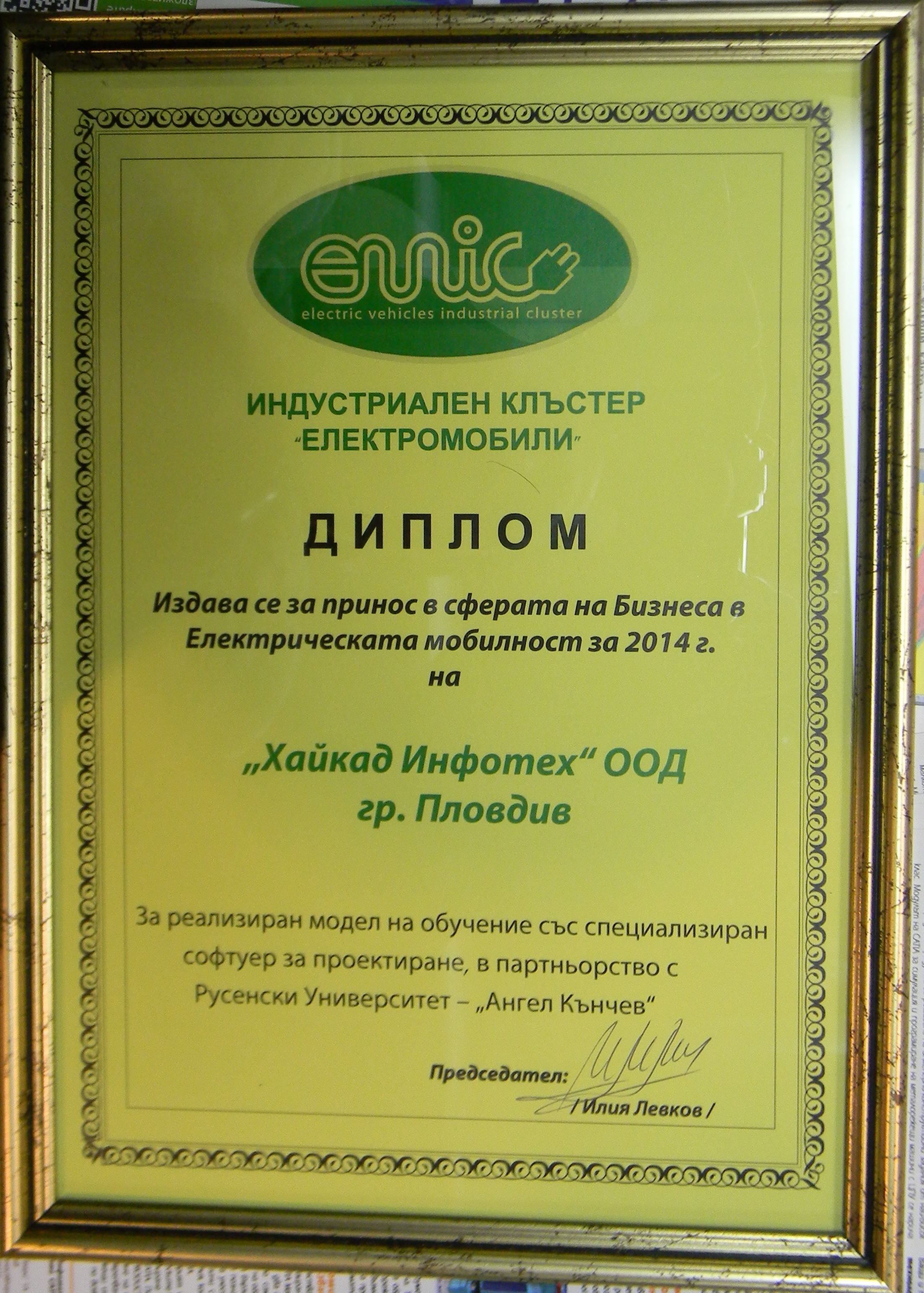 На 13.03.2015 г. Фирма Хайкад Инфотех   ​в рамките на участието си на предстоящото специализирано изложение за машини, технологии и индустриално оборудване MachTech&InnoTech в сградата на Интер Експо Център - София , покани колективи от Русенски университет „Ангел Кънчев”Фирмата бе  номинирана за принос в сферата на бизнеса в Електрическата мобилност за 2014 г. Престижната награда се присъжда от Индустриален клъстер „Електромобили“, а номинацията е за реализиран модел на партньорство на Хайкад Инфотех с Русенски университет „Ангел Кънчев”. (повече информация: http://www.инженер.bg/sofia/events-machtechinnotech)