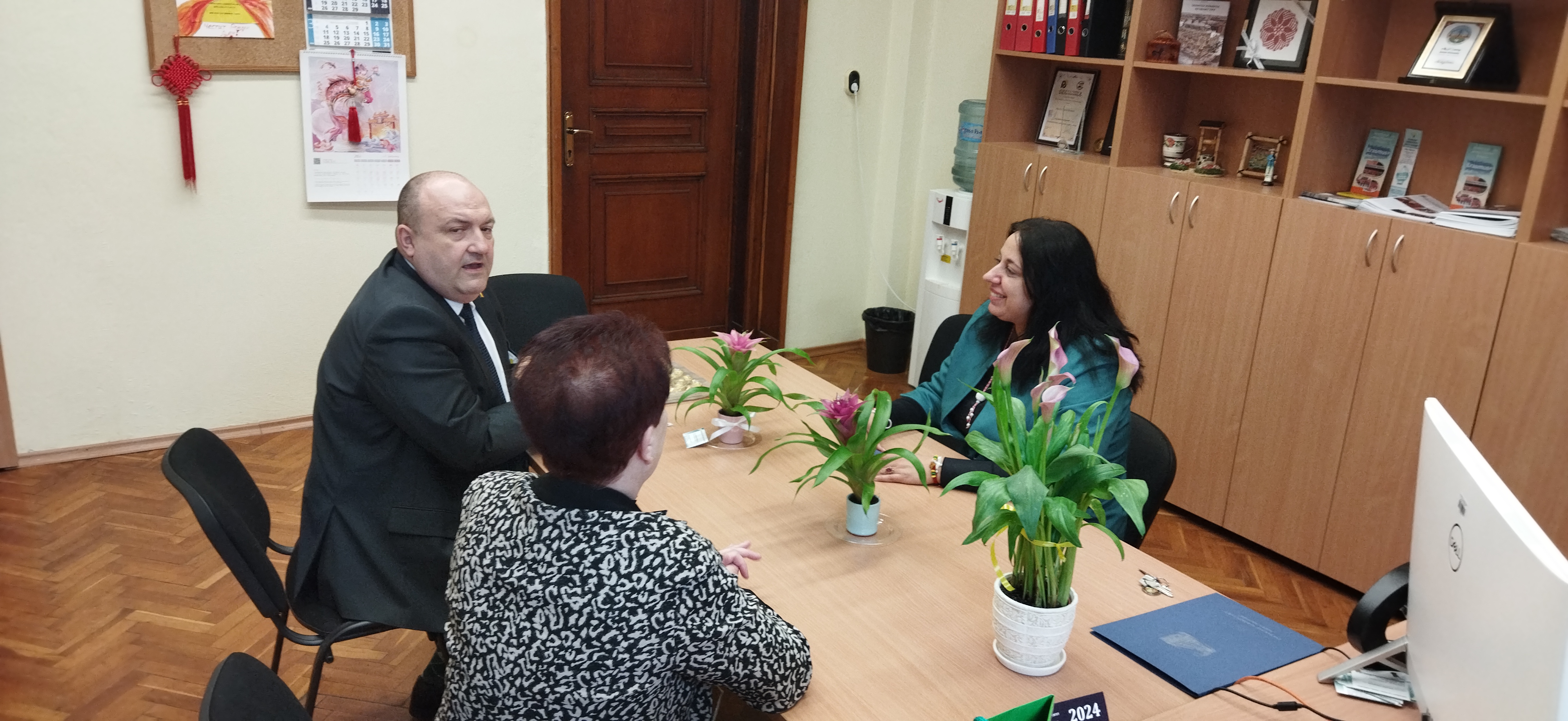 On 1.03.2024 University of Ruse was visited by Assoc. Prof. Emanuel-Stefan Marinescu – Head of Global Affairs of Danubius International University, Galati, Romania. He was met by Assoc. Prof. Galina Ivanova, PhD. – Vice-Rector in International Relations, Prof. Yuliana Popova, PhD. – Interinstitutional Communications Coordinator and Diana Georgieva – Senior expert in International Relations. He greeted the new management of University of Ruse and wished that the good cooperation between the two institutions should be kept and expanded to new study areas. Assoc. Prof. Ivanova and Assoc. Prof. Marinescu presented several international conferences organized by their universities which are excellent opportunities for lecturers to upgrade their professional knowledge.