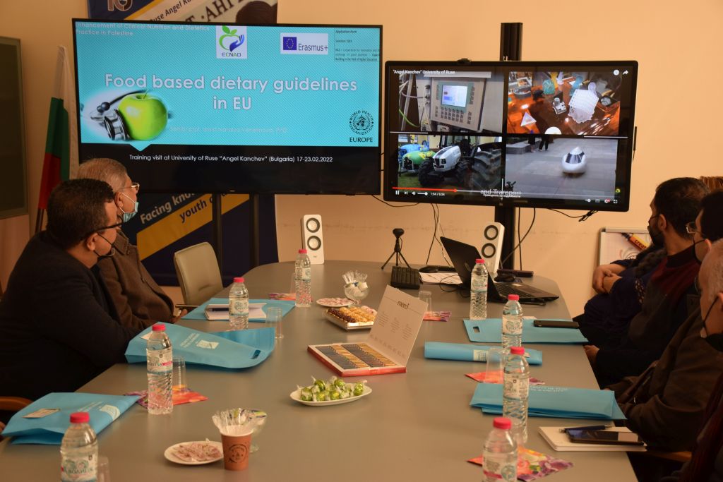 Today, 23.02.2022, was the last day of the successful study visit of Palestinian lectures in clinical nutrition and dietetics at the University of Ruse. In the course of a week, the 10 colleagues from Palestine discussed problems of the specialised hospital nutrition for various chronic diseases; nutrition of newborns and most recent practices in it, introduced by WHO; problems of the national systems for clinical nutrition in the EU member-states. As a partner and co-coordinator in the project „Enhancement of practice in clinical and dietary nutrition in Palestine“, the University of Ruse proposed lectures at a European level, prepared by lecturers in the Health Care Department of the Faculty of Public Health and Health Care and the Management and Social Work Department of the Faculty of Business and Management, with the national consultant in clinical and dietary nutrition, Prof. Donka Baykova, PhD as a visiting lecturer in the team.