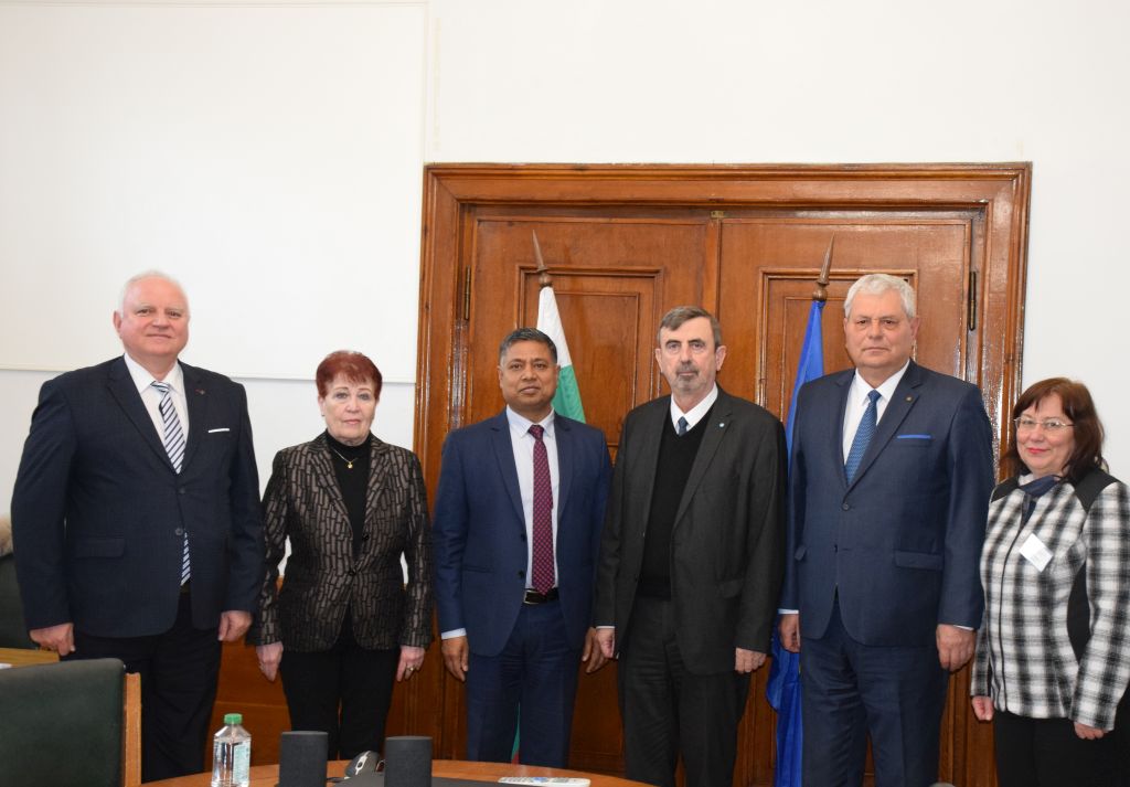 Today, the Ambassador of India H.E. Sanjai Rana visited the University of Ruse. He was welcomed by the Vice-rector in Education, prof. Plamen Kangalov, PhD, the Vice-rector in Development, Coordination and Continuous Education, Prof. Plamen Daskalov, PhD, the Director of Foreign Students Directorate, Prof. Krasimir Martev, PhD and Prof. Juliana Popova, PhD – coordinator in institutional communications.