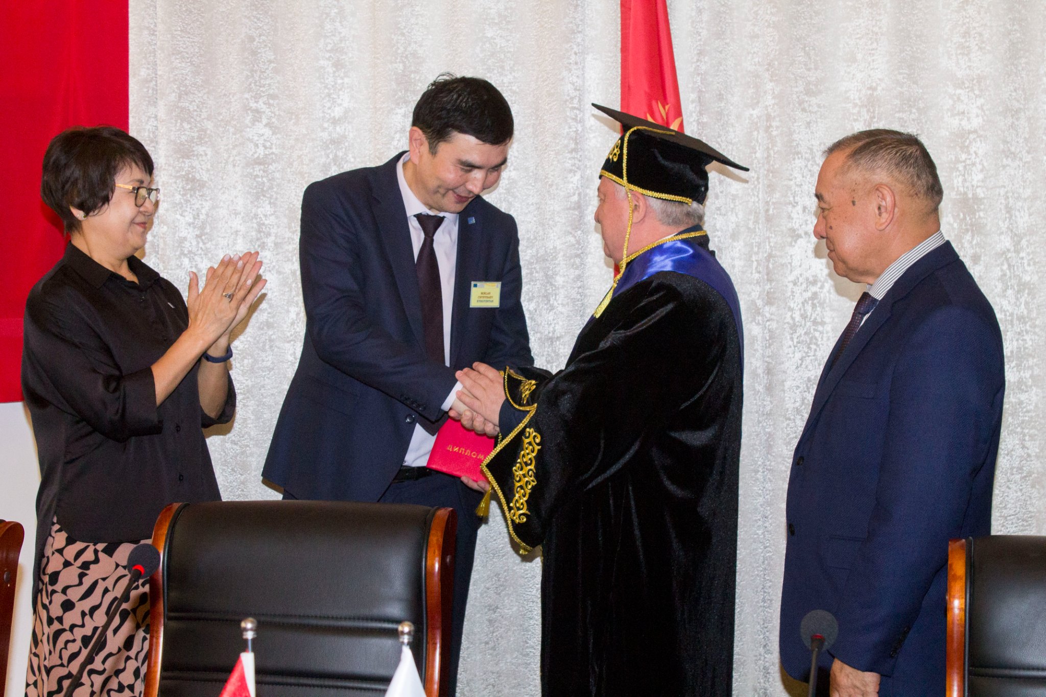 The Rector of KSTU, prof. Mirlan Chinibaev, announced the decision of the Scientific Council of the University for conferring the honorary title to Acad. Beloev and then the ceremony was held.