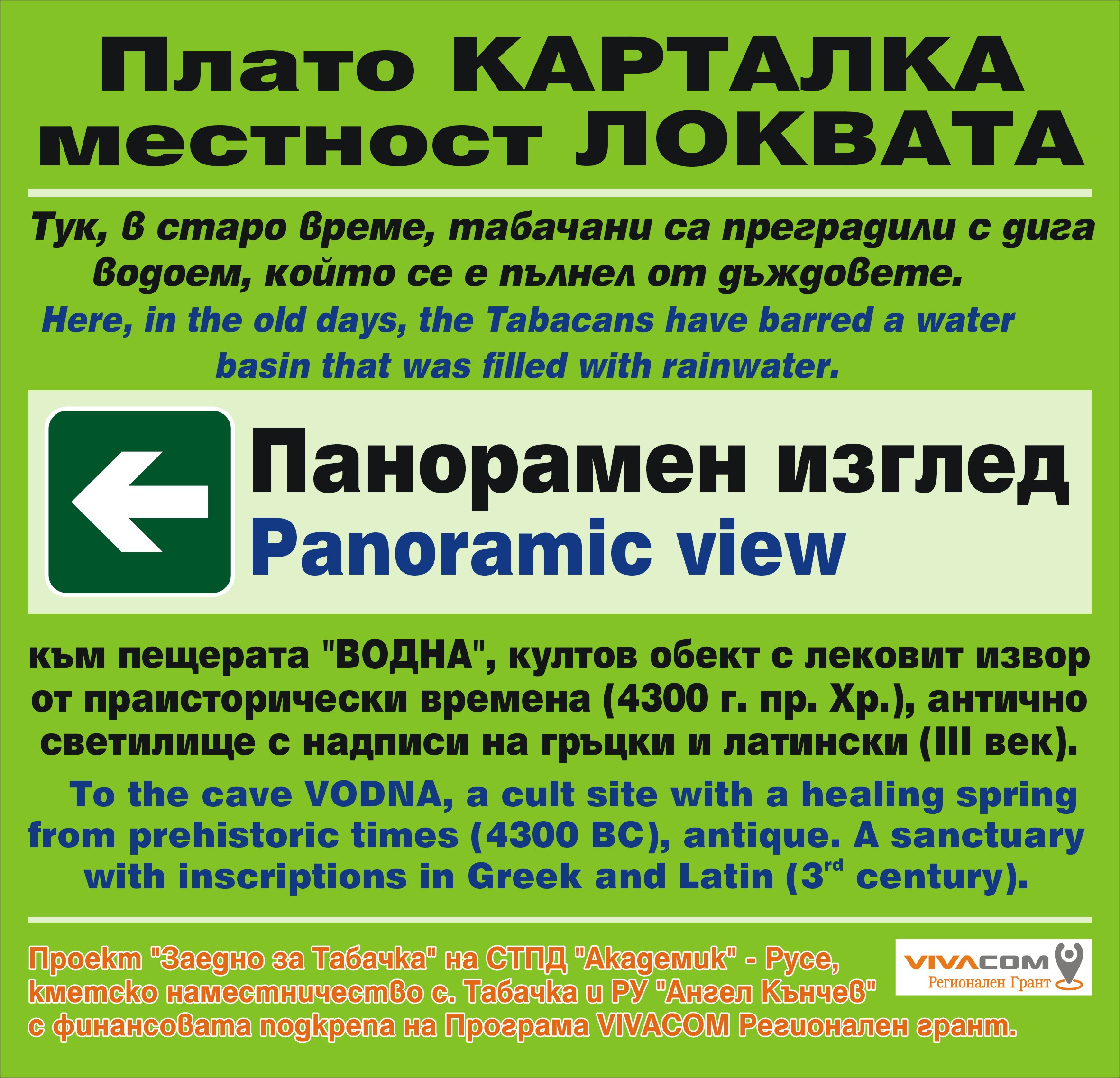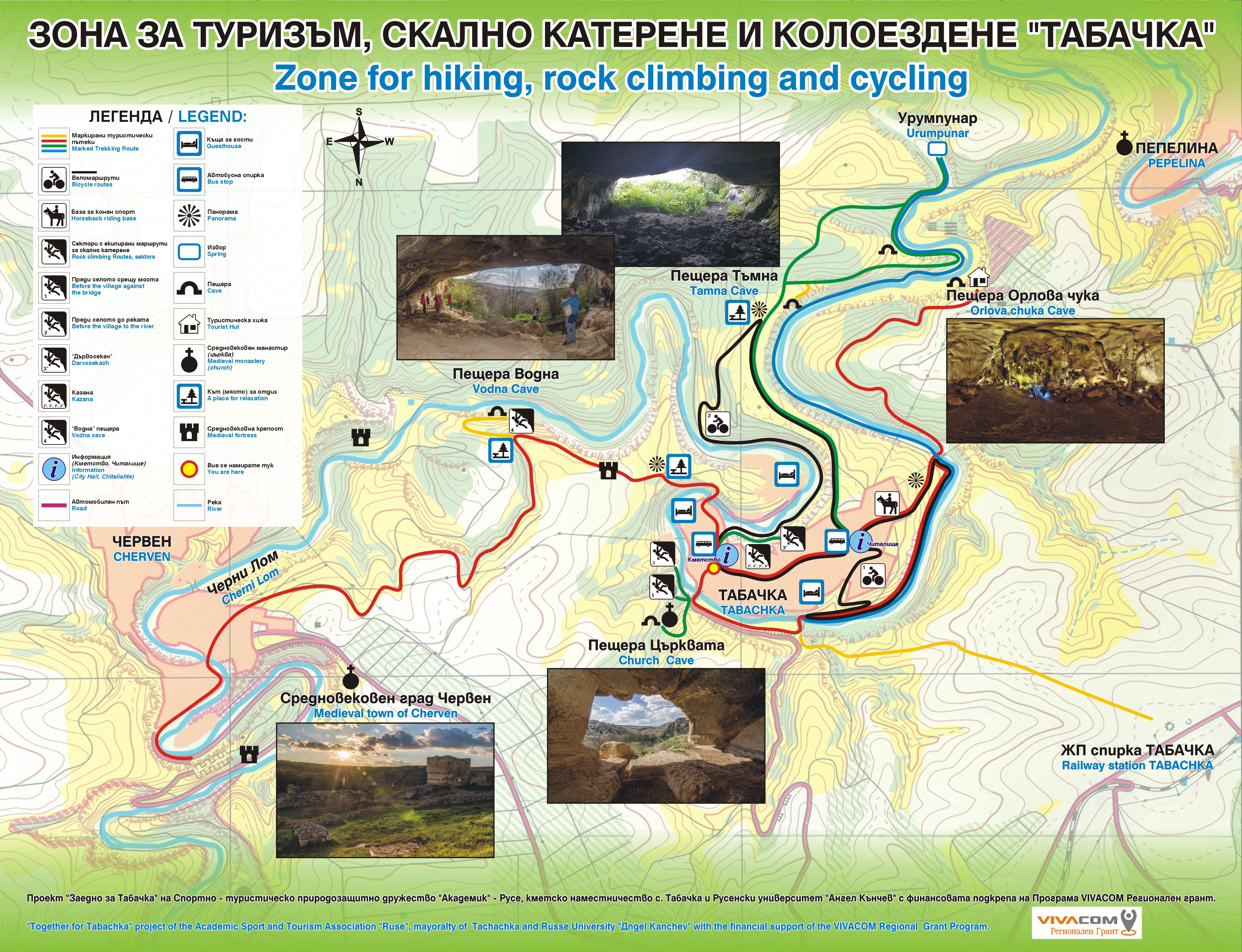 25.10.2017 г. Екипът от трасьори, маркировачи и дизайнери на проект ЗАЕДНО ЗА ТАБАЧКА приключи успешно една от ключовите дейности по проекта. Завършена бе работа по съставянето, предпечатната подготовка, печатането и конструкциите за поставяне на трите броя маршрутно-информационни табла с челен надпис ЗОНА ЗА ТУРИЗЪМ, СКАЛНО КАТЕРЕНЕ И КОЛОЕЗДЕНЕ ТАБАЧКА.